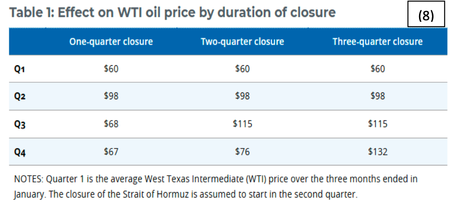 That roughly 21-mile-wide body of water, the Strait of Hormuz, realistically can create a recession. These 21 miles provide a shipping route for most oil produced in the Persian Gulf, about 80% of which then flows to Asia. But with the potential for a $500 Iranian drone to sink passing vessels the ultimate concern has become attacks on oil shipping in the Strait, causing unsustainable losses or shipwrecks closing the shipping lanes. Suddenly, the waterway supplying roughly 20% of the world's oil is closed due to Iranian threats. Basics of supply and demand theory suggest a higher price of oil when a 20% decrease in supply occurs, not to mention an estimated 18%-20% the fertilizer used on United States farms is shipped on that same strait. Assuming you've been following along with past Moore Financial Solutions quarterly reviews, you're astute to the stock market's fear of inflation. Rightfully, inflation remains a foremost worry of stock market investors and with WTI Crude moving from roughly $57.32/barrel to begin the year to over $99/barrel to end Q1. It seems clear that inflation now will not decrease at the assumed rate, with interest rate cut projections following in line. With many anticipating (prior to the conflict in Iran) continued disinflation and further interest rate easing, and some of our strategy in line with these progressions, we find it troubling that though inflation/interest rates were headed in a favorable direction, that trend will likely now end. We're in our sixth year of managing money for our cherished clients while President Trump is in office. During that time the broad take away is a fear to become conservative or make changes when stocks dip (which would be rare as we generally attempt to buy stocks during fearful downturns) because at any moment a Truth Social post from the president could occur stating a ceasefire, agreement, strait opening, etc. In the previous Trump administration, we sought confirmation of a U.S./China trade deal capable of moving markets meaningfully higher in seconds. Research by the Dallas Federal Reserve suggests hypothetical oil prices based upon the duration of closure within the Strait of Hormuz. These projections cite oil at $115/barrel if closed two quarters, and a projected $132/barrel if a three-quarter closure is to happen.