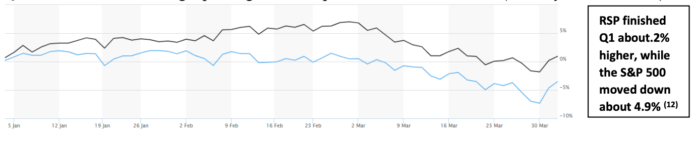 Within our quarterly commentary we aim to discuss trends happening within the broad stock market, and if possible, allow our readers to freely enact similar trades. As you remember, we've been focused on the Mag 7, and you can catch up on the details on what that is, and what risks pertain to the Mag 7 by reading our previous quarterly review. We focused particularly on how highly concentrated major indexes such as the S&P 500 have become as it relates to these seven huge companies. At that time, those seven companies made up over 35% of the S&P 500. For the first time since the Artificial Intelligence boom began in January 2023, every Mag 7 stock is down for the year. The Mag 7 companies in total have shed over $2 Trillion in value as of late March. As you may remember in Q4 of last year we moved about 10% of our holdings in the iShares Core S&P 500 Fund ETF (ticker IVV) to Invesco S&P 500 Equal Weight ETF (ticker RSP) and predicted the Mag 7 stocks, which offered a P/E ratio of about 29 compared to the broad index P/E ratio of about 20, would experience selling from investors who had gains and were waiting for the new year to book the sell orders in 2026. As predicted Q1 '26 was hard on the Mag 7 pushing those companies about 12.16% lower (ticker symbol "MAGS").