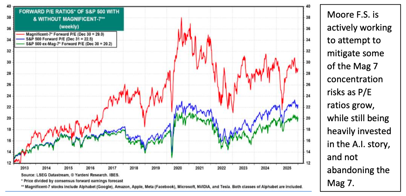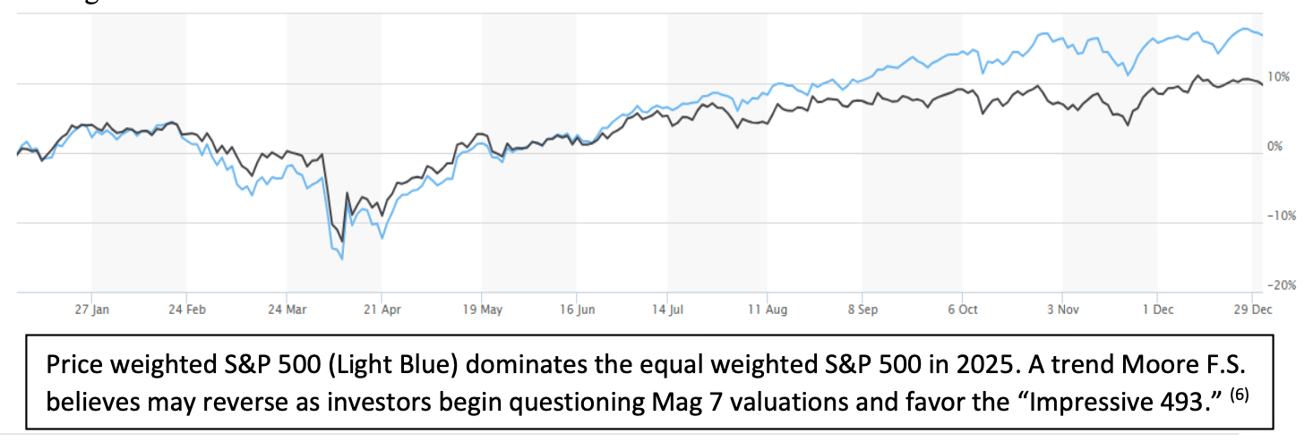 As 2025 ends, we joyfully review another positive quarter for the S&P 500, with it logging about a 2.3% gain, plus dividends (1). Much like a banked 3-pointer in a game of basketball, we won’t complain about scoring points, even though it may not have looked pretty, with extreme volatility near April (and again seven companies creating a large portion of gains.) Realistically, the annual return of 16.39% on the S&P 500 for the year is great, especially when it follows 24% and 23% returns the prior two years (2).However, we take exception to the continual heavy lifting done by the “Mag 7” (Google/Alphabet, Nvidia, Microsoft, Tesla, Meta/Facebook, Apple, and Amazon) as they now make up nearly 35% of the S&P 500. The other 493 stocks making up the S&P 500 represent the other approximately 65% of the index and only returned approximately 10% for the year. I will discuss much more on this and how Moore F.S. has attempted to mitigate some of this Mag 7 risk. Additionally, we’ll discuss interest rate movements along the yield curve, the Federal Reserve, and share our most recent trade and strategy for 2026.